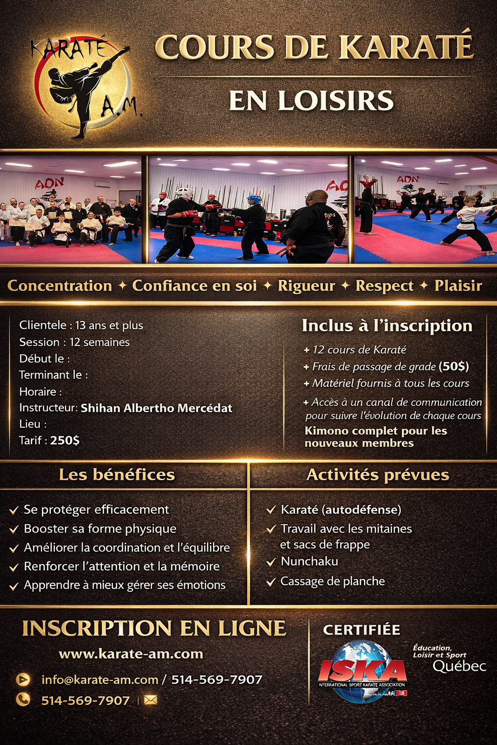 Karaté A.M. propose des cours de karaté en loisirs pour les jeunes, adolescents et adultes (8 ans et plus), adaptés aux centres communautaires et aux programmes de loisirs de la Montérégie. Encadrés par Shihan Albertho Mercédat, instructeur certifié et reconnu par ISKA Canada, nos cours allient discipline, plaisir et développement personnel.